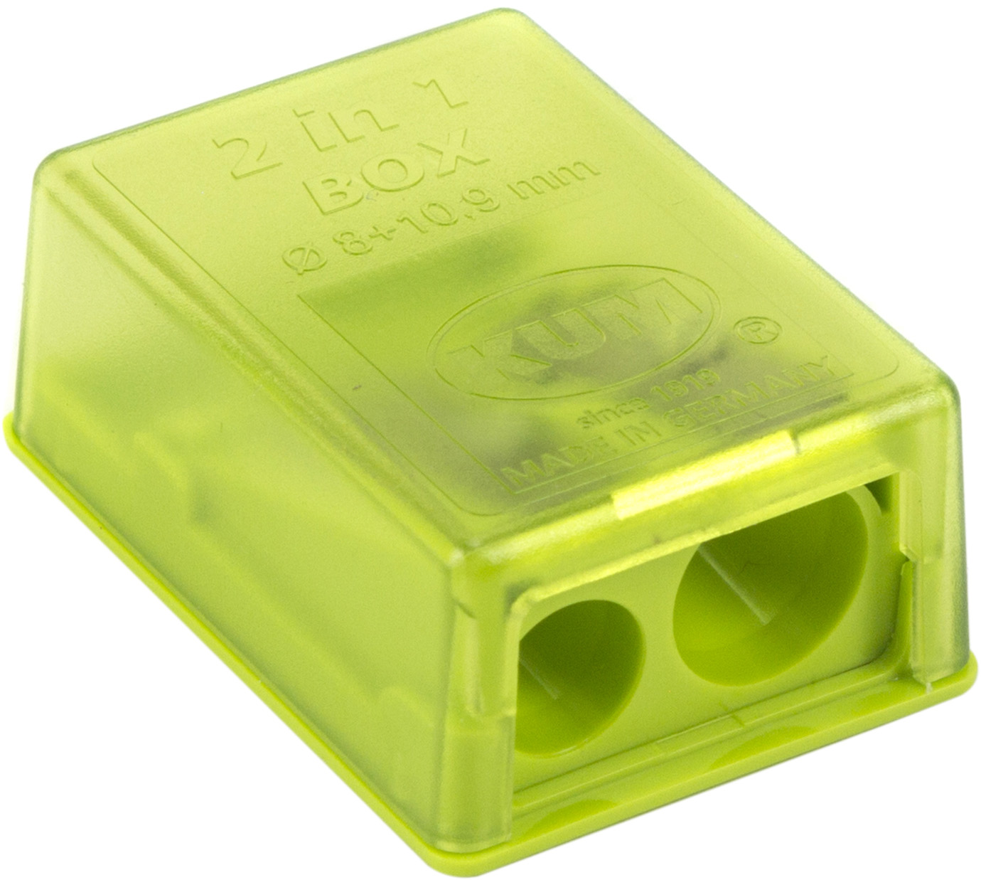 Прямокутна точилка KUM з 2 отворами для заточування олівців діаметром 8 і 11 мм. Компактний міні-контейнер (ідеально підходить для шкільного пенала). Надгострі вигнуті леза з легкістю заточують будь-які олівці, навіть олівці поганої якості. Корпус з первинного пластику дуже міцний, виконаний максимально точно. Леза захищені від іржі. Асорті прозорих кольорів Pop: рожевий, блакитний, салатовий, жовтий.