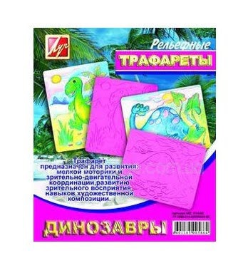 Рельєфний трафарет "Динозаври" призначений для дитячої творчості. Трафарет не має традиційних прорізів - малюнок виступає над плоскою поверхнею. Щоб отримати малюнок на папері, трафарет кладеться під аркуш, а зверху папір штрихується за допомогою воскових олівців. Метод штрихування особливо корисний при підготовці дитини до школи. При цьому розвиваються дрібна моторика, зорове сприйняття, акуратність. Також трафарет призначений для розвитку зорово-рухової координації та навичок художньої композиції. Отриманий малюнок можна розфарбувати як олівцями, так і акварельними фарбами. В упаковці один двосторонній трафарет із зображенням динозаврів. Безпечно.