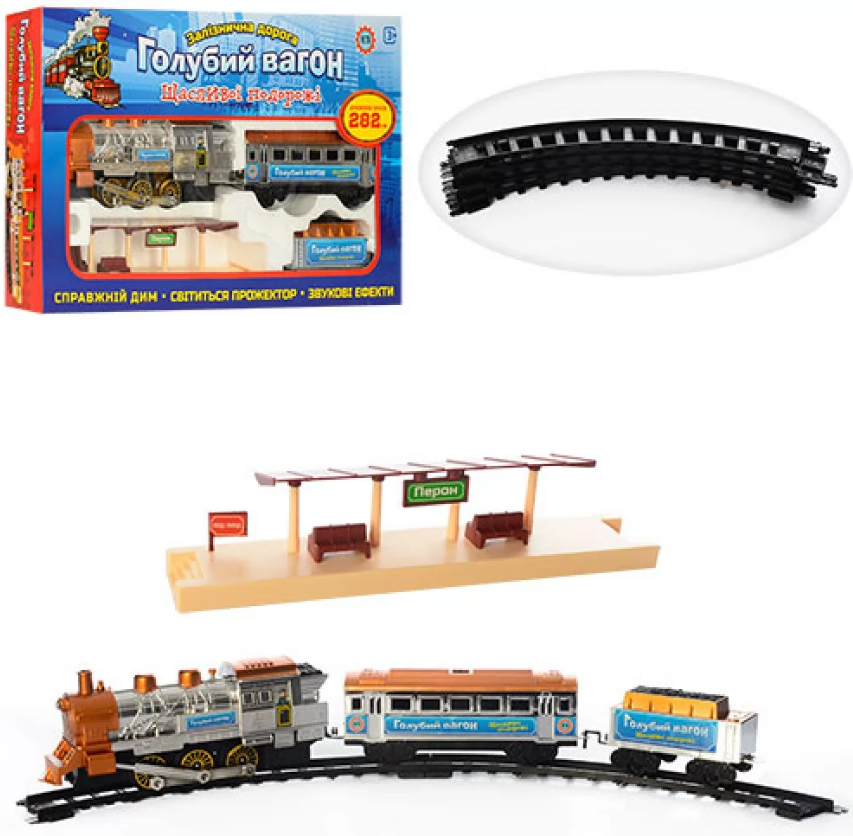Залізниця на бат-ці,муз,світ.Блакитний вагон,дим,довжина шляху 282см,в кор-ці№8041/617(12)