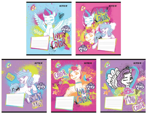 Зошит шкільний на скобі Kite має 12 аркушів, представлений у зручному форматі А5. Аркуші в зошиті зроблені зі щільного паперу, розлініяні в лінію. Виріб представлено в ущільненій кольоровій обкладинці з ліцензованими зображеннями в 5 дизайнах. Ефект на обкладинці:уф-лак+глітер з гібридним лаком. Кольорова задруківка форзаца.