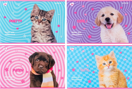 Горизонтальний зошит для малювання Kite в картонній обкладинці. Складається із 24 білих ущільнених (100 г/м2) аркушів формату А4, скріплених скобою з мікроперфорацією. Обкладинка представлена в чотирьох дизайнах. Зошит для малювання рекомендований для дітей шкільного віку. Ефект на обкладинці: гібридний лак з вибірковим УФ-лаком.